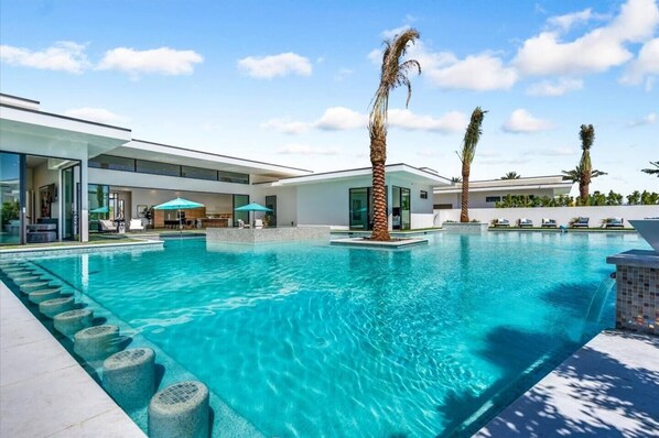 A massive pool with plenty of features such as very large tanning shelves perfect for kids or to lie down in the sun, fire bowls, and LED waterfalls. Chic contemporary style with walls of glass and slideaway Fleetwood doors, oversized great room with 16' ceilings, 12' ceilings in other living areas and bedrooms, gorgeous floor tiles imported from Spain, and stunning open kitchens with European cabinetry and top-of-the-line Miele appliances. Every bedroom is a suite, complete with a private bath and a large closet. Primary suites elevate personal luxury to new heights, with outdoor access, walk-in multi-head showers, freestanding tubs, and oversized walk-in closets with Italian-made custom built-ins. Enjoy the beauty of modern lighting, contemporary artwork, chic furnishings, Grohe plumbing fixtures, and pivoting glass entry doors.