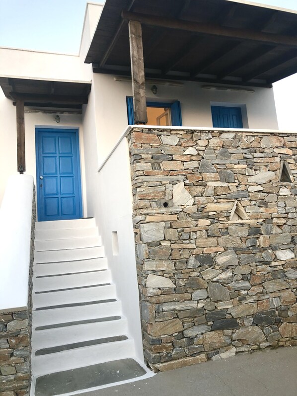 A cosy 40 sq.m. studio (one bedroom, kitchen, bathroom) of typical Cycladic architecture, just 80mts from one of the best beaches of Ios island (Koumpara), offering amazing sea view. The location is just 2 km from Ios Port and 3 km from Ios Village.
