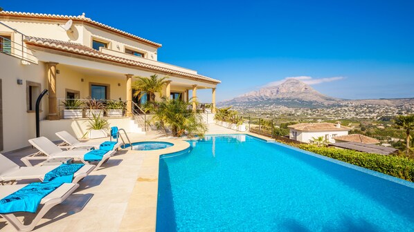The villa offers total privacy; the 10x5m infinity pool also has a jacuzzi; the panoramic view of the bay, the sea, the valley and the mountains is incredible.