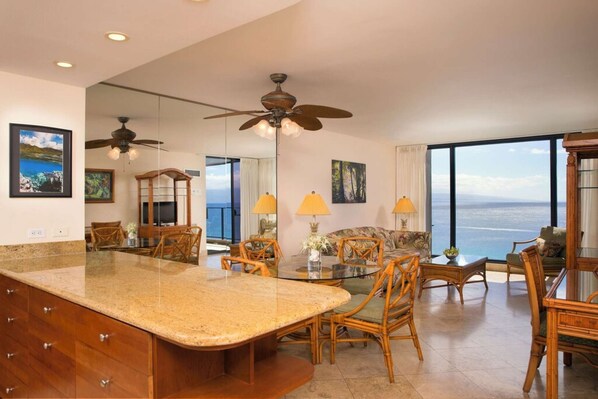 All day long you can see and hear the waves and spot the whales from the balcony. When we arrived, the condo was immaculate, the kitchen is well equipped and the bathroom had plenty of nice towels and necessities. The closet was spacious and stocked with hangers. There are several restaurants and a grocery store near by. Each evening we walked along the beach to enjoy the sunset.