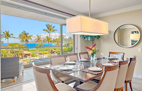 We encourage you to express your culinary creativity in each fully appointed kitchen. We have provided every appliance and utensil to concoct the perfect meal or refreshment; just bring the ingredients. Enjoy your meals on the spacious lanais or dine indoors in the climate-controlled air-conditioning. In addition, our commercial-grade Vitamix blender is well-suited to preparing creative libations or smoothies with fresh local produce.