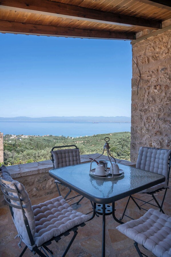 As an exclusive highlight, guests have access to a charming stone tower located on the grounds, featuring a private outdoor area with breathtaking views over the Messinian Gulf—an unforgettable spot for morning coffee or evening wine under the stars.