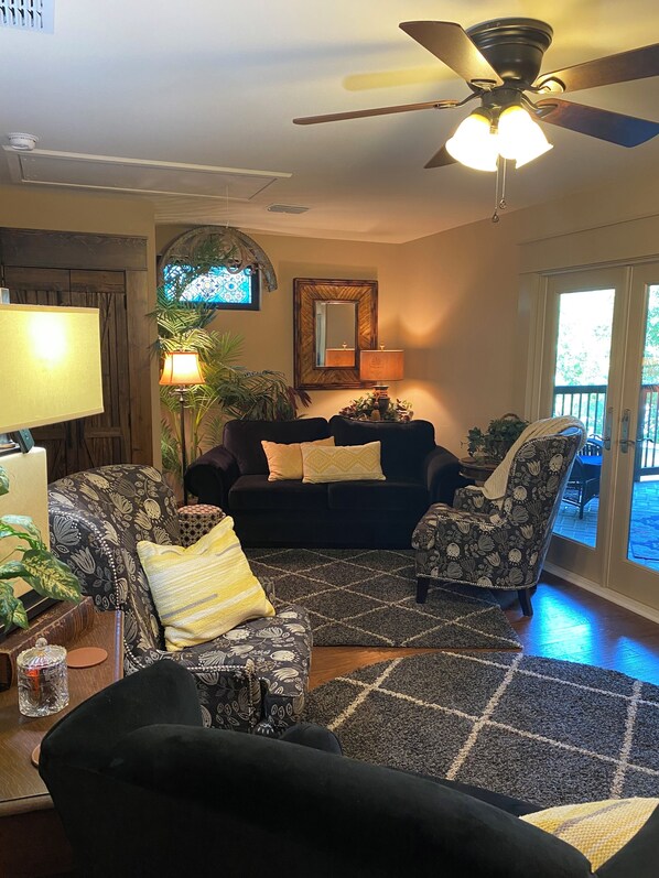 This is an upstairs fully equipped apartment that has cozy, private, romantic atmosphere. Has a covered outdoor patio, with comfy furnishings, fan, large ‘smart TV’ and gas outdoor heater. Continental breakfast goodies always included with no extra charge. Breakfast bar with ceiling fan and a view. Full kitchen w/gas stove, farmhouse sink, RO water faucet, microwave, fridge with RO ice mkr, drip & pod coffee pots, espresso maker, toaster, blender, elec mixer and griddle, slow cooker, pots/pans, dishes, silverware, etc. etc. Dining/living room with sofa, recliner, 2 occasional chairs, large ‘smart TV’, ceiling fan, electric fireplace and games. There is an enclosed area with a full sized washer/dryer for our guests convince. Large beautiful bedroom with king bed, luxury linens, ceiling fan, plus table fans on each side of bed, ‘smart TV’, makeup table with lighted magnifying mirror/fan and bench, occasional chair, dresser. Separate, tiled toilet/vanity area>marble sink vanity, large mirror and closet, plus a separate enclosed spa shower area with seat. Kerrville is a great base for motorcyclists, bicyclists and old car enthusiast - Texas Highway 39 hugs the Upper Guadalupe River, we are not actually on TX 39 BUT can serve as a great staging point for the rest of the Hill Country, no matter which direction you choose to go! We are close to Bandera, Leaky, Lost Maples State Park, Medina, Comfort, Ingram, Hunt, Fredericksburg, Luckenbach, Sisterdale, Boerne, the 'Three Twisted Sisters', etc.. You could even go on a day tour of the nearby wineries, breweries and distilleries - if you like, a limo will pick you up And drop you off right at our door!