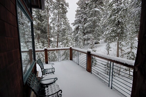 Oleskelu- ja ruokailuhuoneen hieman koholla, varjoisalla kannella on valikoima ulkotuoleja, pieni pöytä ja kaasugrilli. On muutamia vaiheita, jotka johtavat maanpinnan tasolle. Houkutteleva Alppien takapiha-alue on metsäinen, ja niissä on kevyitä rinteitä, joissa on kiviä ja jotka on naturalisoitu paikallisten vuoristolaitosten kanssa. Se on ihana ja rentouttava paikka istua kesällä luonnonkasvien kanssa.