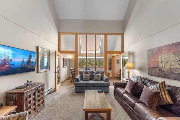 Tämä loma-asunto sijaitsee ihanteellisella paikalla rakennuksen rauhallisella puolella, joten saat rauhallisen oleskelun samalla kun pääset käyttämään kaikkia aktiviteetteja. Olohuoneessa on iso viihtyisät huonekalut, taulutelevisio ja puulämmitteinen takka. Sohva vetää ulos queen-size-vuode. Auringonhuone on olohuoneen vieressä ja antaa luonnolliselle valolle virtata sisään. Auringonhuoneessa on kaksi oleskelualuetta, joista toisessa on futon ylimääräistä nukkumisjärjestelyä varten. Lisävuodevaatteet ja peitot vuodesohvalle ja futonille ovat kaapissa.