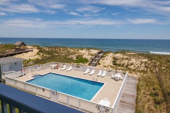 Top Of The Banx is your personal window to the beauty of the Outer Banks offering panoramic views of the ocean looking east and south. This 2-bedroom, 2-bath oceanfront condo and located on the third floor so there is nothing between you and the amazing views. The slider in the living room/dining room leads you to the private oceanfront deck allowing you to enjoy a quiet morning coffee and an soothing afternoon beverage in addition to many meals outside while watching the waves. The fully-stocked kitchen has open sight lines to the amazing oceanfront and includes top-of-the-line appliances. The living room provides guests with a large screen TV, expansive seating that includes a queen sleeper. The primary bedroom includes a relaxing king bed and spacious private bathroom. The guest room has two cozy twin beds and a full bath. The convenience of a stackable washer/dryeris provided just off the kitchen. The garage storage bin is stocked with an assortment of items including chairs, umbrellas and other amenities for your enjoyment while visiting the beach. Private Wi-Fi is provided for the technology-minded guest.