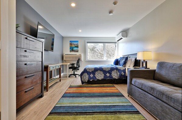 Enjoy the open living space with a desk area, smart TV, Wi-Fi, and serene garden views. Thoughtful touches, including air conditioning for summer stays and shared washer and dryer access in the entryway, enhance the comfort and practicality of your visit.