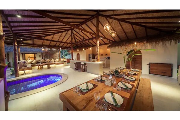 Above ground, the large living space offers a lounge area, dining space for up to 12 people and a fully furnished Western style kitchen in an open tropical setting.
