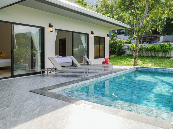Outside, your private pool overlooks unspoiled jungle and mountains—ideal for sunbathing, morning yoga, or sunset cocktails. A generous terrace wraps around the home, providing both shaded and sunlit areas for lounging. Whether you're preparing meals indoors or dining alfresco, the villa makes everyday moments feel special.