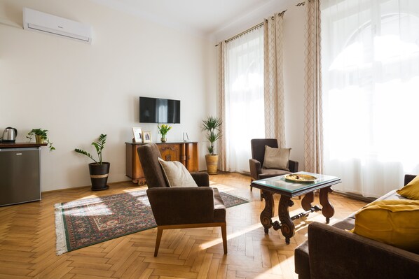 This was a last minute booking without sufficient review. Love the location however, given the proximity to the university and being a through street to the square there is ongoing noise night and day/ pedestrian and vehicular traffic. At times people congregating on ground floor and being very loud throughout early morning hours. And there is a restaurant below, with deliveries, garbage collection etc. it’s a busy hub. Bare in mind that this is a very old building and windows appear original … This place is ideal for someone that is either a great sleeper or doesn’t plan on resting much / great place to come and go out of. Well equipped with most basics.Could use more towels or more absorbent towels, or I recommend to bring your own. Pillows most likely need a replacement as were lumpy. Like someone else noted, the shower is on the smaller side / ok for us but would be way too Small for anyone with a larger frame. Such that I couldn’t see my 6’2 ft/ 195 lbs husband being able to use it comfortably. If not for the noise we’d stay here again.