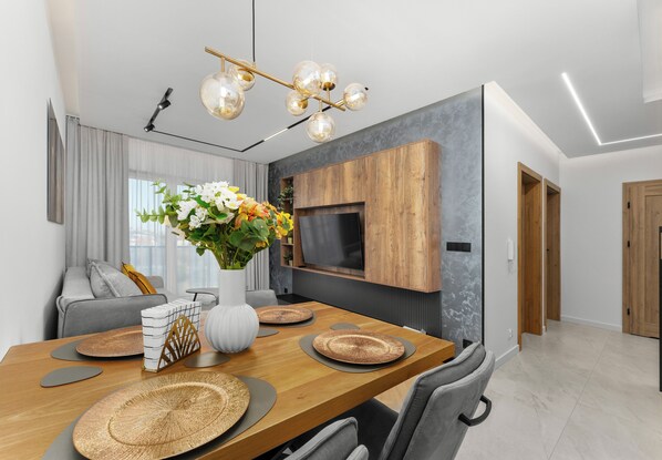Górka Narodowa Superior Apartment is a stylishly furnished apartment featuring a living room with a sofa bed and a kitchenette, two separate bedrooms, a bathroom, and a spacious balcony where guests can relax and enjoy a morning coffee or an evening glass of wine. Guests have access to a range of practical amenities, including free Wi-Fi, terrestrial TV, a washer-dryer, an iron, a hairdryer, a fridge with a freezer, a dishwasher, an induction cooktop, an oven, a microwave, a kettle, and kitchen accessories. A parking space in the underground garage is also available.