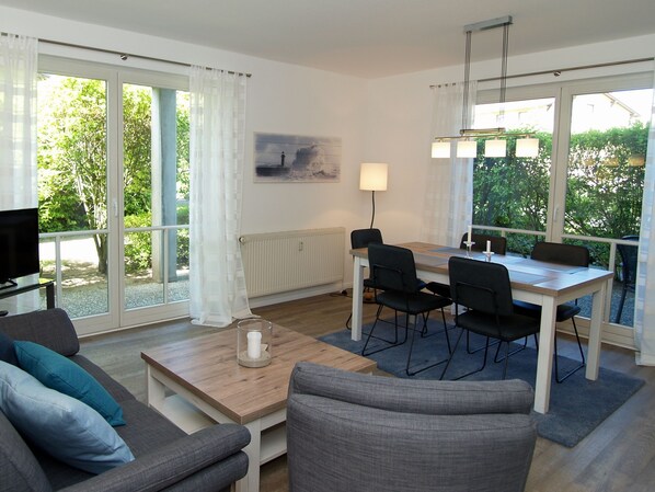Asut 62 m²: n 3-huoneisessa huoneistossa, joka sijaitsee alakerrassa. Olohuoneessa on varustettu oleskelualue, ruokailutila, TV, radio ja keittokomero (liesi, kahvinkeitin, leivänpaahdin). Makuuhuone parivuoteella, makuuhuone 2 erillisellä vuoteella ja kylpyhuone suihkulla ja wc: llä täydentävät tämän asunnon kokonaiskuvaa. Alkuvälineenä on saatavana henkilöä kohden pesulapaketti. 2 kalustettua terassia, autopaikka, oma pyörävaja