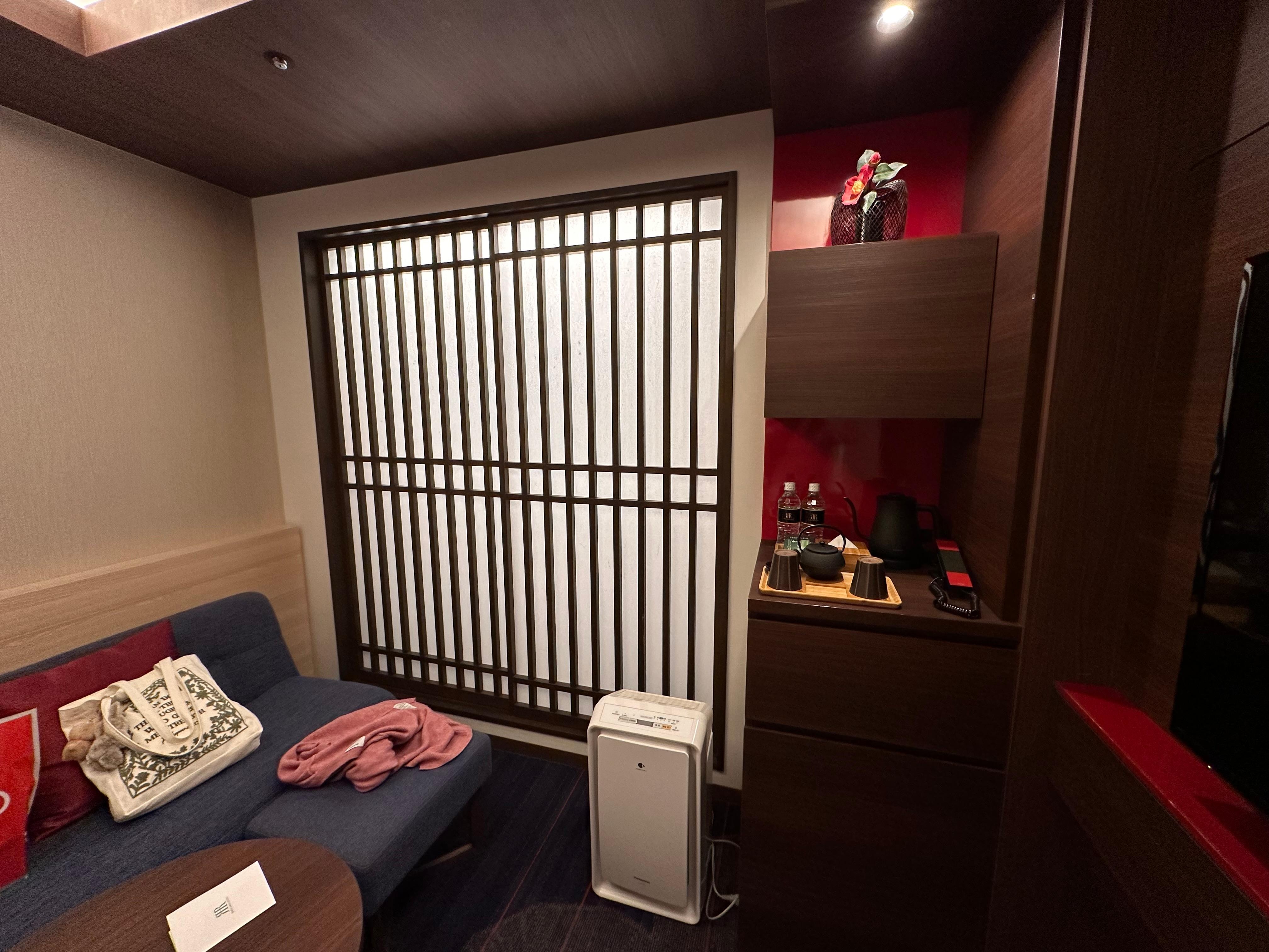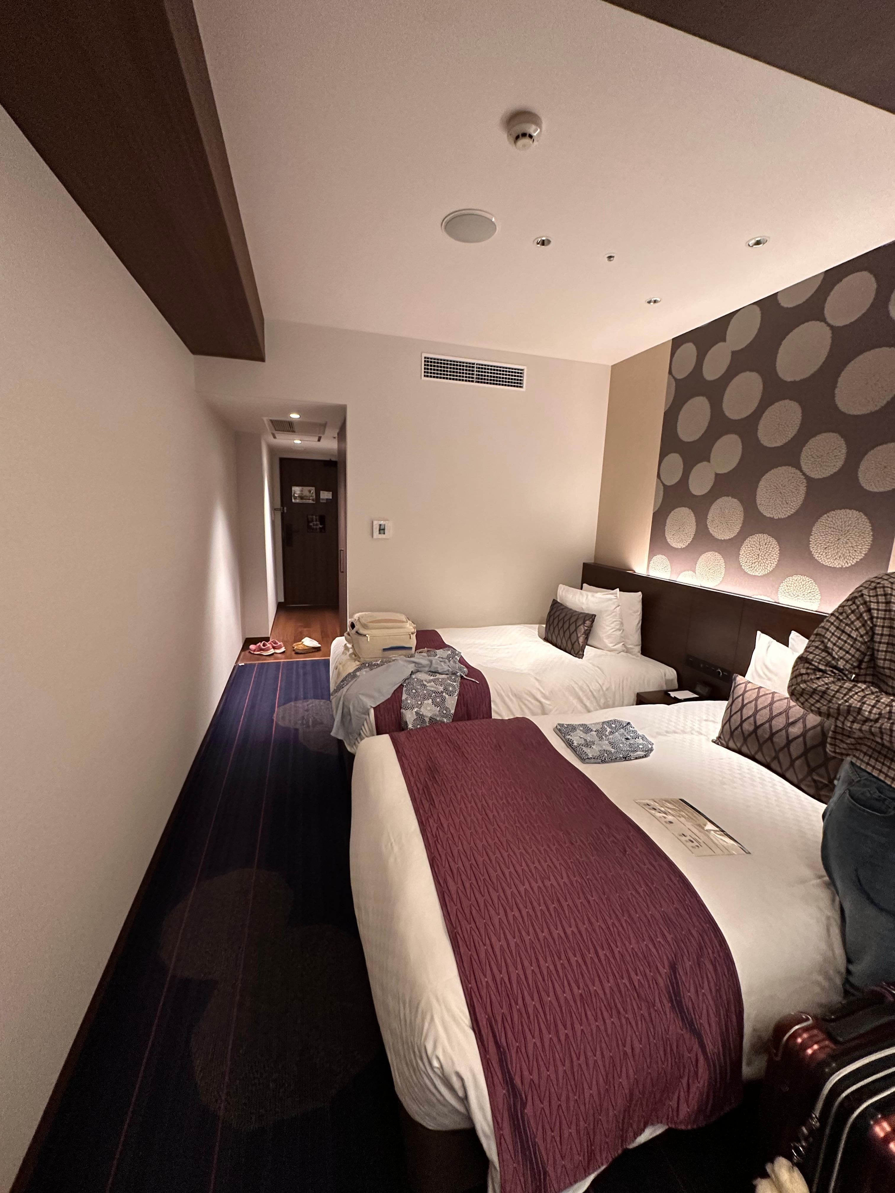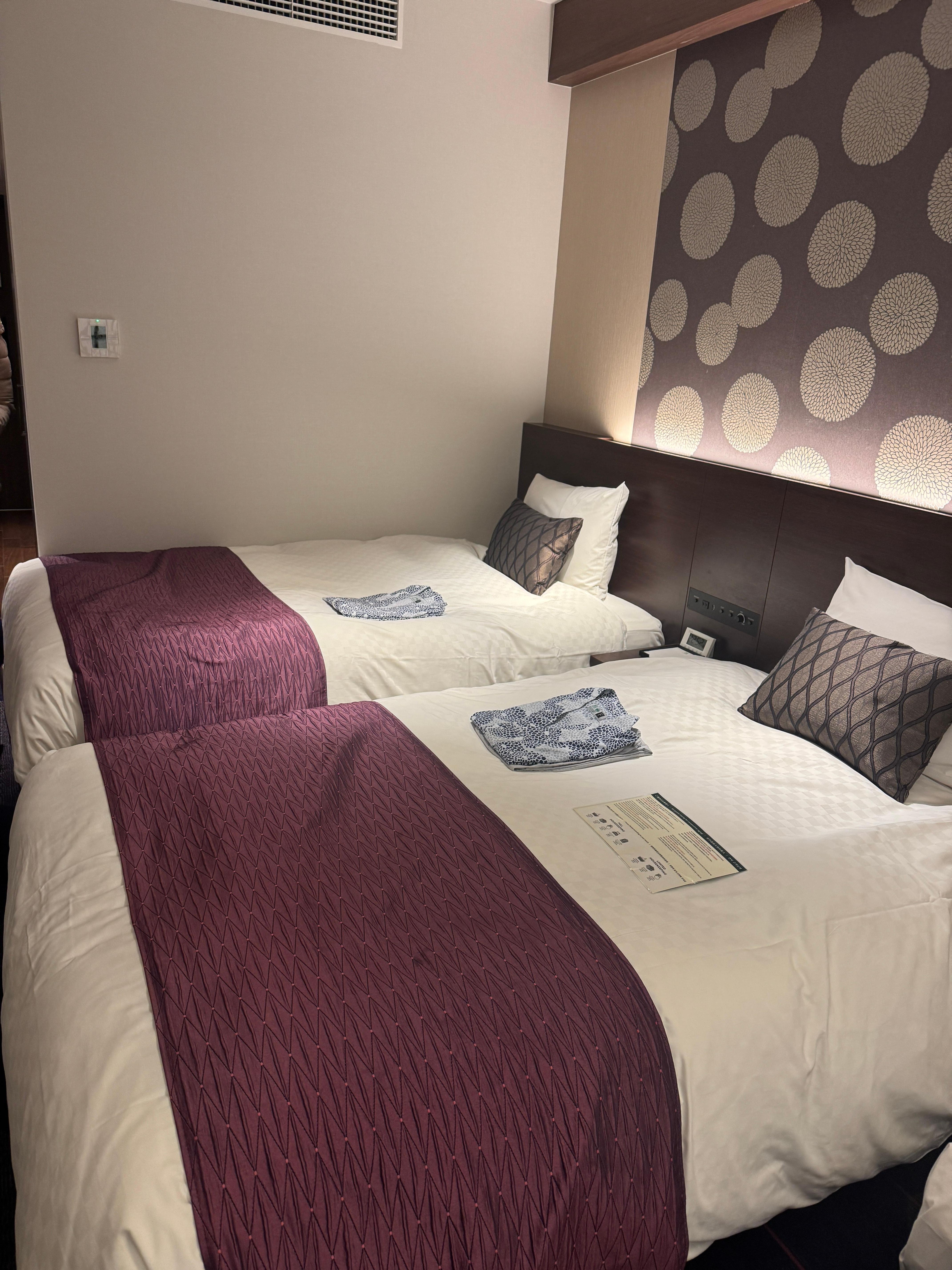 Wonderful hotel! Beds are so comfy. Although room is a little small, it’s a little big already for Japan standards. We had the standard double room, and the beds are twin XL beds, a bit tight for 2 ppl to sleep in, but they did make the sofa bed wonderfully for my daughter so we were all comfy. Love how they have free drinks, and free locker service. It’s close to the station like 2 blocks which is not too bad. Breakfast was good. Amenities were good. Staff is excellent! I can definitely recommend!
