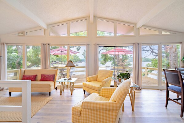 Private Location and Two well-outfitted homes right next to each other with 300 ft. of shoreline at the Lake of the Ozarks! Hosting six bedrooms, four bathrooms, and at-home comforts. Plenty of parking, a fantastic getaway for you and your family, and something for everyone to enjoy. Both homes are close to the water with a gentle walkway down the shoreline, a Dock, boat slip, water gear—noodles, water mat—or exploring local attractions close to HH. Take an easy walk to Alhonna Resort & Marina for food, drinks, and indoor/outdoor pools, or stay home for a BBQ on the patio with Aruba Blue Outdoor furniture! The space Lakeshore | Fishing Gear | Free WiFi Mallards 1 Bedroom 1: King Bed | Bedroom 2: King Beds | Bedroom 3: Two bunk four Twin beds: Mallard 2 4: Bedroom King bed I 5 Queen 6 two bunks with four twins. Sleeps 16 guests. Wood-burning fireplaces and a lake view from the family room and master bedroom are also included. Washer and dryer, screen in patio, and enjoy your time reading on comfortable deck furniture. LAKE LIFE: Private dock & lake access, water mat, spacious deck w/ charcoal grill & lounge seating, screened-in lakeside porch, fishing poles/net KITCHEN: The essential appliances, dishwasher, snack bar countertop w/ bar seating, breakfast nook, coffee maker, blender, Crockpot, cookware, dishware/flatware MODERN INTERIOR: Fast WIFI, Smart TVs, fireplace, dining table, vaulted ceilings, open layout, large bedrooms and bathrooms GENERAL: Central heat & A/C, linens, towels, 2100 sq. ft. FAQ: Circle parking, dock with boat slip, 7MM by water and on Mallards Point by land, step-free interior access, stairs from back door to deck PARKING: Driveway (6 vehicles, +water toys, and boats)