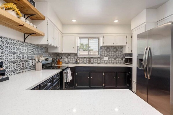 Spacious 4BR/2BA home in a quiet Las Cruces neighborhood near Old Mesilla, restaurants, shopping, and parks. Sleeps 12 with 4 queen beds, 2 air mattresses. Family-friendly: stocked kitchen, smart TVs, WiFi, games, pack ’n play, fenced yard, fire pit, keypad entry. Exterior doorbell and driveway cameras (no interior cameras). No parties, pets, or smoking. Quiet hours 10PM. Additional guests beyond reservation: $25/person/night. Unapproved guests will incur extra charges or cancellation. This spacious single-family home features four private bedrooms, two full bathrooms, and plenty of room to relax. Each bedroom includes a queen bed, closet, and dresser—plus blackout curtains in most rooms for a restful stay. The primary suite offers a smart TV and private bathroom with a walk-in shower. A second full bath includes a tub/shower combo. The fully stocked kitchen has everything you need to cook, including an electric stove, coffee maker, and dining areas that seat up to 12 guests. The living room includes a smart TV and board games for cozy nights in. Additional sleeping options include two air mattresses. Outdoors, enjoy a fully fenced yard with a fire pit and space for games, BBQ grill and patio furniture. Free driveway and street parking available. Family-friendly extras like a high chair and pack-n-play are included. Exterior cameras are installed: a doorbell camera at the front door and a security camera monitoring the driveway. No cameras are inside the home or in private areas. These devices are for safety and monitoring of exterior areas only. Guests have full access to the entire home, including all four bedrooms, two bathrooms, a fully stocked kitchen, dining areas, living room, and laundry room. Enjoy the spacious fenced backyard and fire pit with BBQ grill. Parking is available in the driveway and on the street. Family-friendly items like a pack-n-play, high chair are included. We respect your privacy but are always here if you need anything! You can reach us by phone or message anytime during your stay. We’re happy to help with questions, recommendations, or anything that makes your visit more comfortable. Self-check-in is available with a keypad, but don’t hesitate to reach out if you need support! A cleaning fee applies to each booking. We kindly ask guests to take out the trash and place bins at the curb on Thursday night. Quiet hours begin at 10PM to respect our neighbors. This is a smoke-free, pet-free home. If you have any questions before booking, feel free to reach out—we’re happy to help!