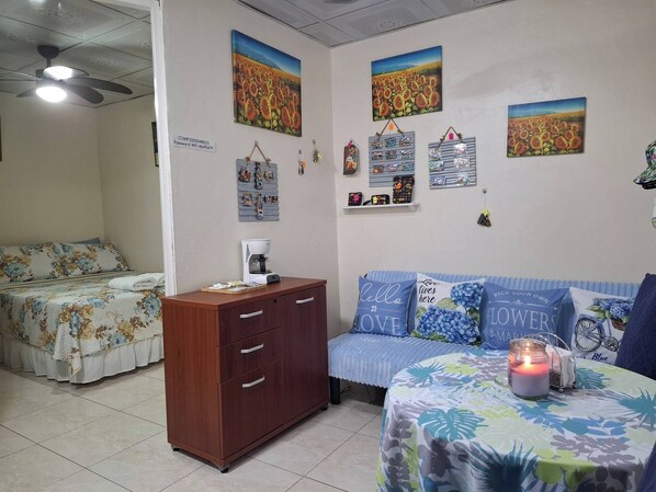 Our apartment has air conditioning, fans, a TV with cable channels, and free Wi-Fi throughout.