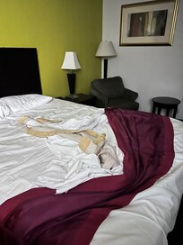 Slept in pir clothes to make sure we do t catch anything . Got up at 6:30 .My husband wanted to take a shower but I guess it was not scubbed for decades. So dirty. Walls were dirty with some spackles on the wall by the toilet. God only knows what was it . Bed sheets looks like they were washed millions of times even blanket that was considered to be a comforter was like grandma donated it in years ago