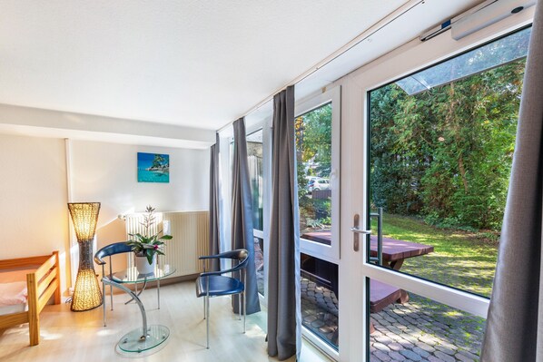 In front of the apartment, you have your own wooden bench with a table. The private, uncovered terrace offers extra space to relax and enjoy the tranquil atmosphere.