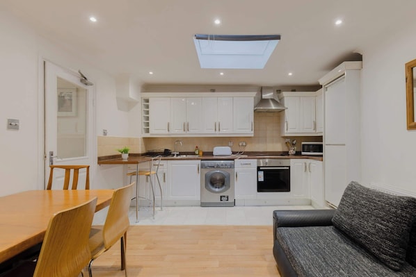 Within the living space, this kitchen offers both function and charm. A calming beige backdrop and a skylight above bring in plenty of natural light and character, whilst the sleek white cabinetry provides generous storage. You'll find all the essentials for a comfortable stay, including a cooker, hob, toaster, kettle, full-sized fridge/freezer, and washing machine - what more could you need? Whether you're whipping up a quick breakfast or settling in for a home-cooked dinner, this bright and well-equipped kitchen has everything you need.