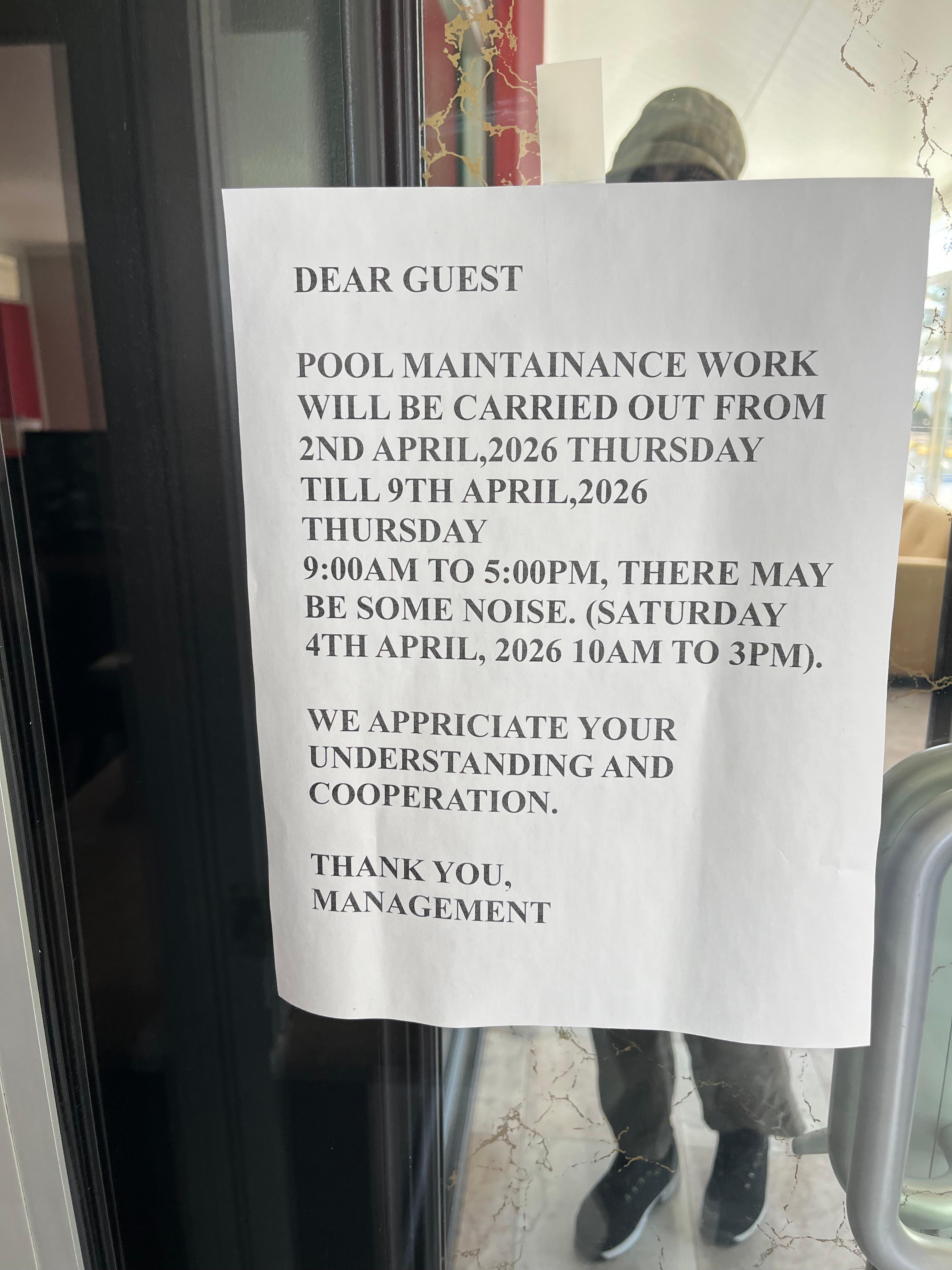 I travel a lot and go from hotel to hotel. I chose this hotel because it has a pool and it was extremely hot in LA. But when I arrived the pool was getting emptied and the next 2 days there was unbearable noise for pool maintenance (jackhammer all day — see video provided). To the point that I couldn’t work in the room and had to get out for 2 full days during the maintenance hours. I have a lot of work and swapping hotels was not possible for me last minute but I asked for a discount gesture (to their discretion) given that I could not use the room for 2 full days but they refused (and nothing warned about this during the booking process, there only was a piece a paper warning that “there may be some noise”, which is absolutely not matching the huge disturbance this created. I’ve never seen this in a hotel before (I would have been fine with a small gesture). I would avoid Wyndham in the future as they are not customer focused at all.