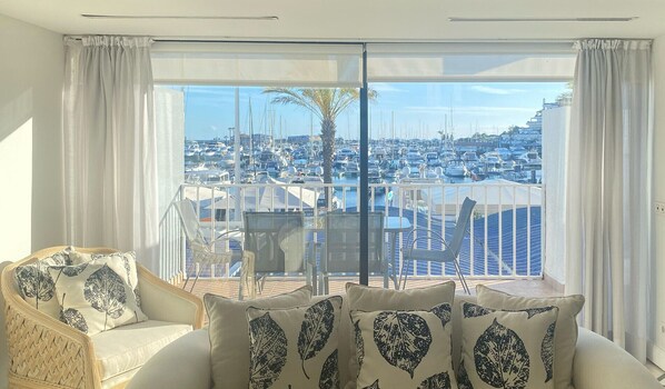The living room features large windows showcasing a stunning marina view. Whether you're unwinding after a day of exploration or enjoying a cosy evening, this space is perfect for relaxation.