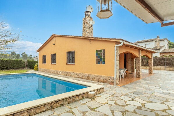 Boasting a beautiful view of the mountain, the villa Casa Raymond with step-free access and interior is located in Maçanet de la Selva. The 105 m² property consists of a living room with a sofa bed for 2 people, a kitchen, 3 bedrooms and 1 bathroom as well as an additional toilet and can therefore accommodate 8 people. Additional amenities include Wi-Fi, a TV, a fan as well as a washing machine. A baby cot is also available. This accommodation does not offer: air conditioning. Welcome to our vacation rental with an enticing private outdoor space. Take a refreshing dip in the pool, bask in the lush garden, unwind on the open terrace, find shade on the covered terrace, savor grilled delights on the barbecue, and rinse off in the outdoor shower.