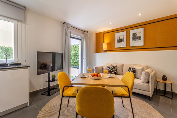 The living/dining room is the heart of the apartment, flooded with natural light thanks to the large windows that open onto the private terrace. The décor is vibrant and colorful, with sleek furnishings and modern accessories.