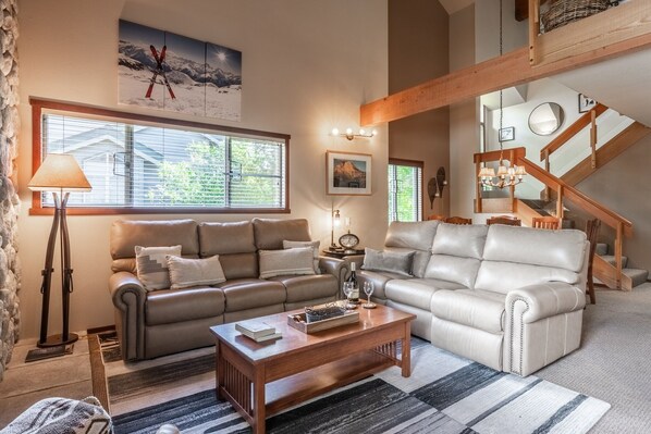 1 484 neliön jalka huoneisto avautuu tilava kaksikerroksinen oleskelutila, jossa lattiasta kattoon joki rock takka, mukava täyspitkä sohva ja loveseat ja kovapuusta sohvapöytä. Olohuone virtaa saumattomasti ruokailutilaan ja keittiön virtauksen avoimessa kerroksessa tilavan parvekkeen alla, jossa kovapuusta valmistettu portaikko johtaa kodikkaan makuutilaa, jossa on kaksi erillistä vuodetta ja nahkainen lepotuoli.