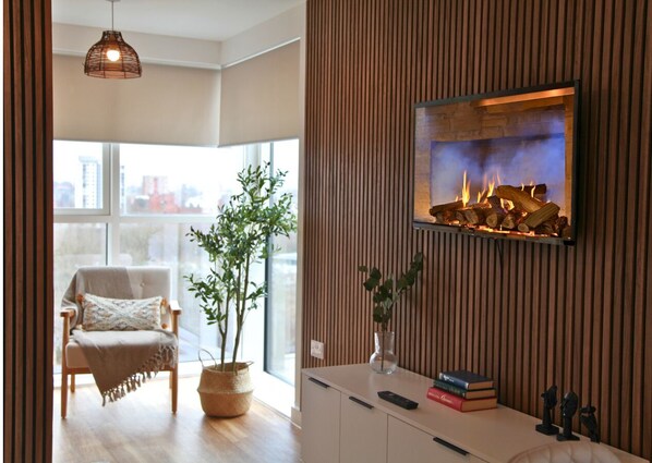 🗝 Stylish Living Room – Relax with a Smart TV and chessboard for entertainment.