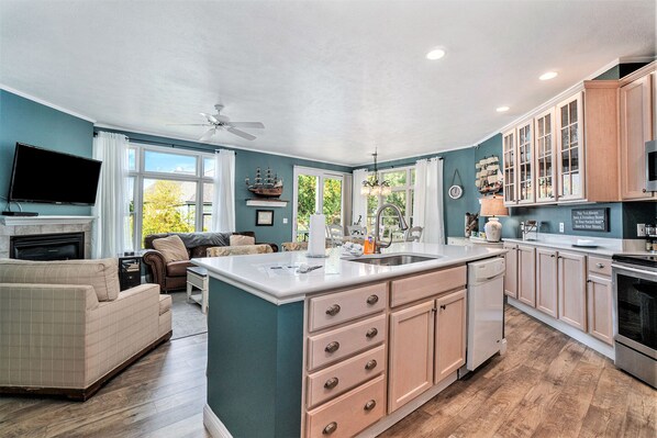 The kitchen is fully stocked for everyday meal prep. Dishes, pots and pans, silverware, glass, etc. A drip coffee maker is available for guest use. Additional kitchen items include microwave, toaster and ice maker. Also included: bed linens, bath towels, basic cleaning supplies, and soaps (not personal soaps), and a starter set of paper products.