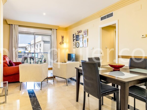 The apartment features a very spacious living room basically furnished with comfortable sofa and armchairs, a large coffee table and also a dining area that can accommodate five people. A huge sliding glass door opens to a beautiful terrace where you have a four-seat terrace dining table.