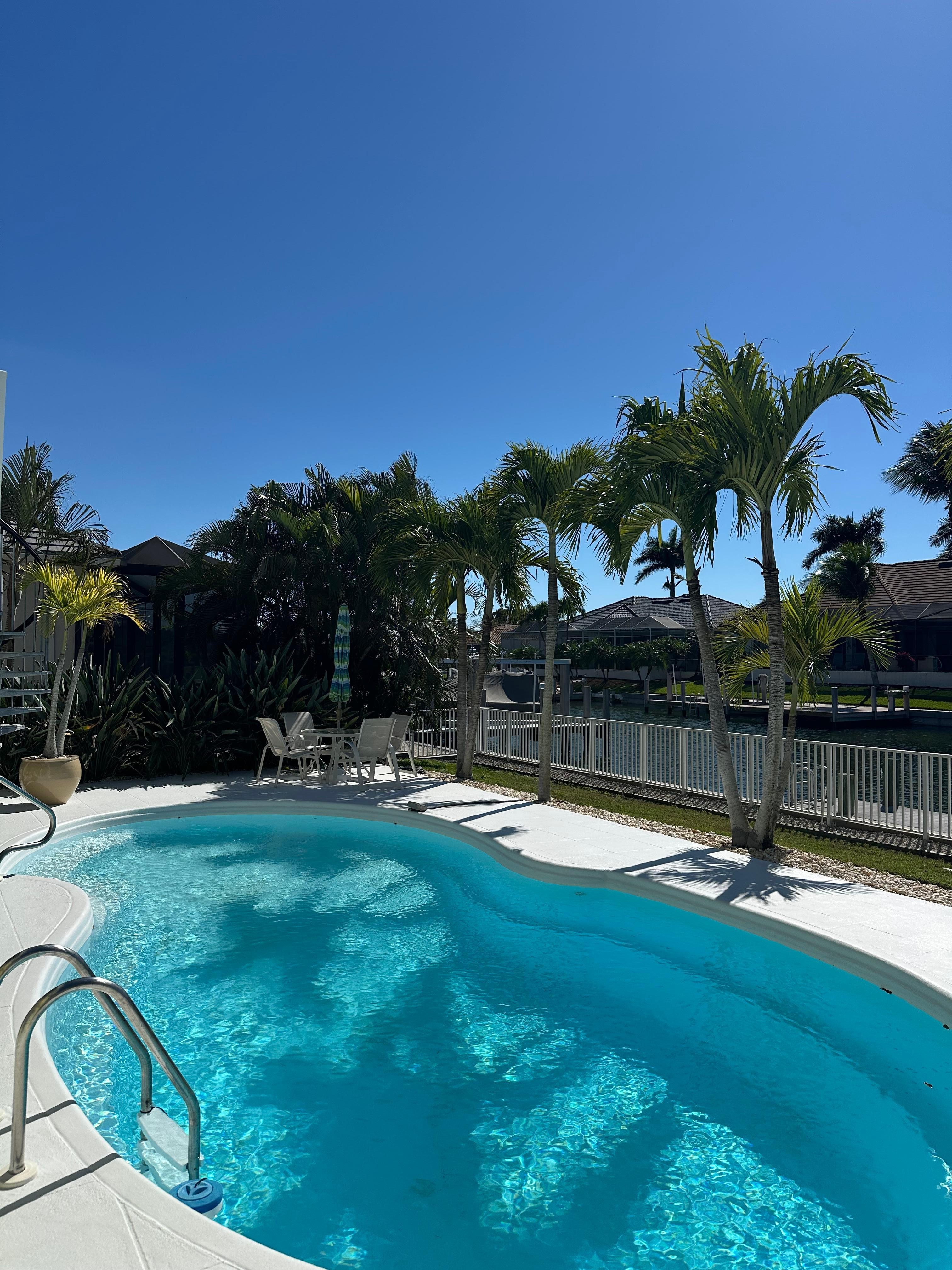 Suuri, yksityinen, täysin aidattu takapiha, jossa lämmitetty uima-allas (80 astetta) ja laaja uima-altaan kansi, jossa on paljon istuimia ja lepotuoleja. Siellä on myös kaasugrilli nauttiaksesi takapihalla sijaitsevan BBQ: n. Rentoudu ja nauti kupillinen kahvia katsellessasi auringon nousua esiportaalta ja / tai cocktailia katsellessasi auringonlaskua takaparvekkeelta, josta on näkymä uima-altaalle ja kanavalle. Länsimainen takavalotus on täydellinen kauniille auringonlaskuille ja koko päivän uima-altaalle. Takapiha on täysin aidattu, joten se on täydellinen, jos matkustat koirasi kanssa. Minkä kokoiset koirat ovat tervetulleita, mutta valitettavasti yhdellä omistajista on allergia kissoille, joten kissat eivät ole sallittuja.