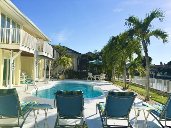 Suuri, yksityinen, täysin aidattu takapiha, jossa lämmitetty uima-allas (80 astetta) ja laaja uima-altaan kansi, jossa on paljon istuimia ja lepotuoleja. Siellä on myös kaasugrilli nauttiaksesi takapihalla sijaitsevan BBQ: n. Rentoudu ja nauti kupillinen kahvia katsellessasi auringon nousua esiportaalta ja / tai cocktailia katsellessasi auringonlaskua takaparvekkeelta, josta on näkymä uima-altaalle ja kanavalle. Länsimainen takavalotus on täydellinen kauniille auringonlaskuille ja koko päivän uima-altaalle. Takapiha on täysin aidattu, joten se on täydellinen, jos matkustat koirasi kanssa. Minkä kokoiset koirat ovat tervetulleita, mutta valitettavasti yhdellä omistajista on allergia kissoille, joten kissat eivät ole sallittuja.