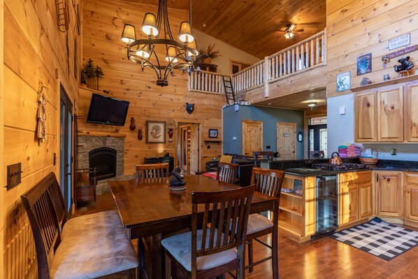 The main level of the home has beautiful hardwood floors, a well-equipped full kitchen, dining table, and a seating area arranged around a gas log fireplace and a Smart TV. Time for bed? Pick one of the four bedrooms. On the main level is a King suite with TV and spacious walk-in closet. The attached private bath has a tiled shower with handheld wand and double granite vanities.