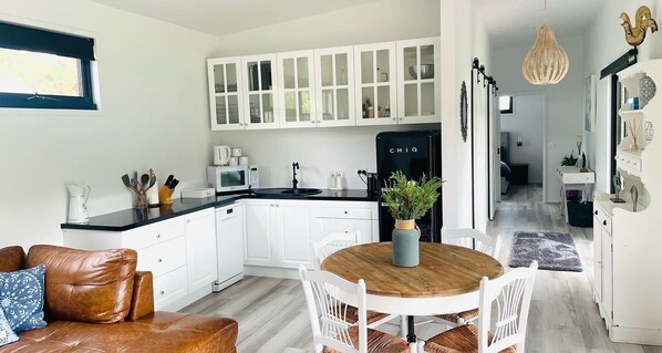 Maple Cottage @Wilindi Estate is a 2-bedroom cottage, with its own private, fenced garden. Interiors have been curated with an eclectic mix of contemporary and antique farm furnishings. The cosy living area with garden views includes a fully equipped kitchenette with bench top oven and dishwasher.
