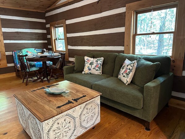 Escape to an eclectic mountain cabin tucked along Lookout Mountain in Mentone, Alabama. Just minutes from DeSoto State Park and Falls, this vibrant retreat blends rustic log charm with vintage-inspired decor and unexpected touches of whimsy.