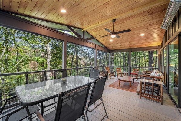 This was a great property for my crew of 6 (2 adults, 3 teens, and 1 older kid). The home is on a beautiful, wooded, riverfront lot with plenty of area to roam, swings for the kids, and porches and decks for days. I LOVED that the only TV in the home is in the living room. This helped keep everyone together during the day, reading, completing puzzles, playing games, and watching movies together. The heater on the porch allowed us to enjoy the screened porch some even in the chilly weather. There were plenty of beds and bathrooms for everyone to be comfortable and well-rested. The space was recently updated enough to have clean, modern conveniences while still maintaining some cozy, older home character. The wall of windows on the main floor lets in amazing light all day, so the beauty of your surroundings can be taken in year-round. I often find vacation rentals lacking in the dish, pots and pans, and appliance department, but this one had everything I needed to cook 2 meals a day for my family during our stay. We really enjoyed this property, and hope to return during a warmer time of year!