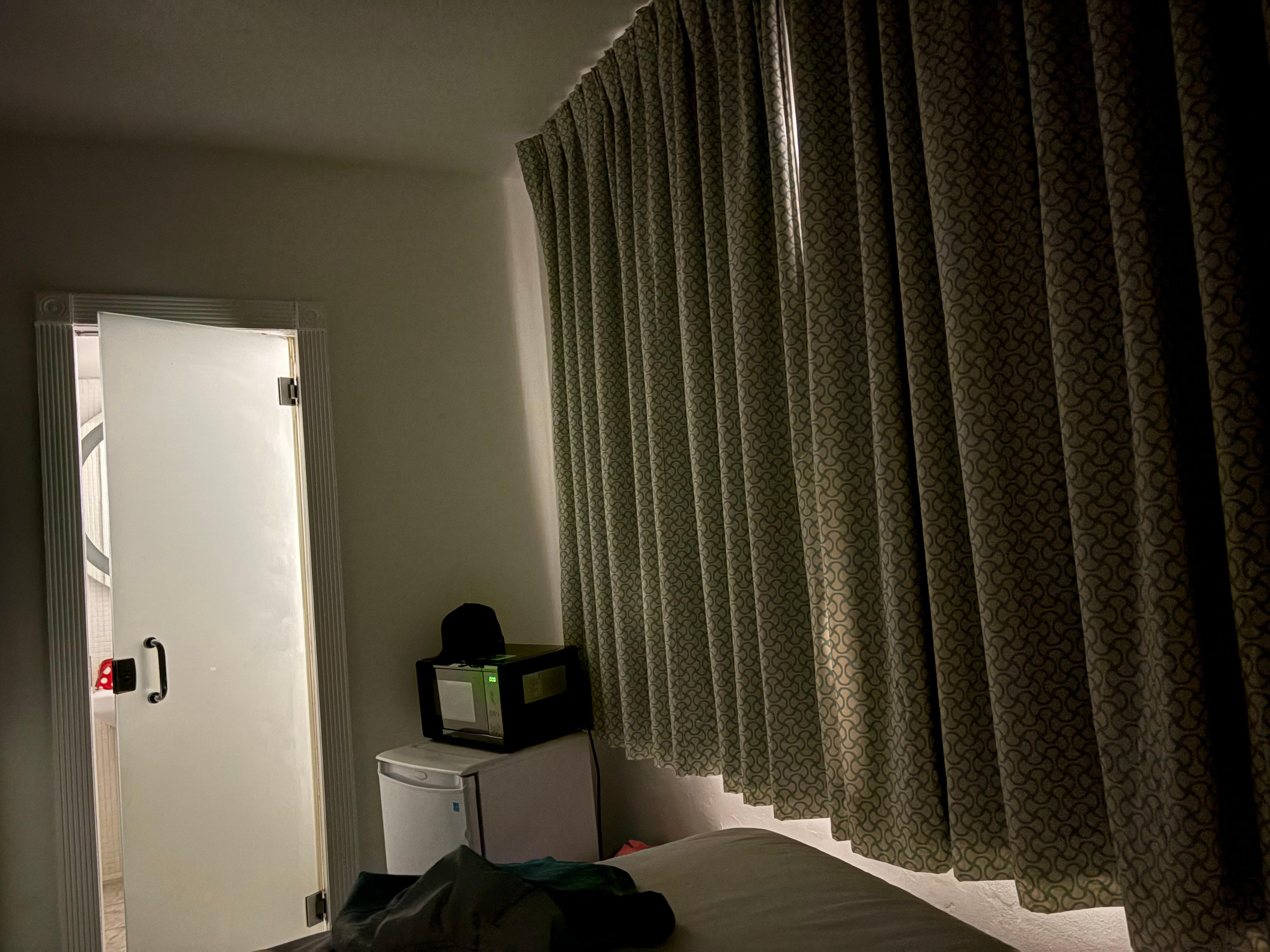 No matter what time of night it was, the room was bright like dawn / dusk. There was an alley light that was bright as fk and there was no window covering on the bathroom window. This wouldn’t be an issue if the g bathroom door wasn’t made of glass!