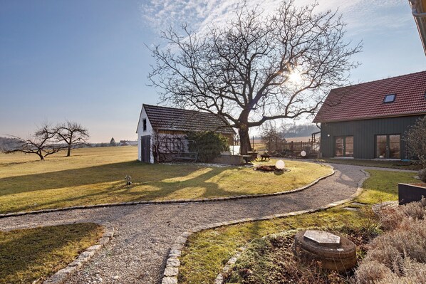 Relax in the beautiful Augsburg – Western Forests Nature Park, an ideal place to unwind. Our accommodation, a fully renovated former farmhouse, is set in a secluded location surrounded by the rolling hills of the Alpine foothills. The large garden is perfect for reading, relaxing, and playing. Garden chairs and ball games are provided. A small grill with accessories is also available for your evening meals.
