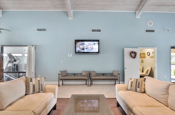 The condo comfortably accommodates up to seven guests. The master bedroom boasts a king-sized bed and an en-suite bathroom, along with a private entrance to the covered back patio. The guest bedroom offers a queen bed and a twin bed, with an attached full bathroom that is also accessible from the living room area. Additionally, the living room includes a pull-out sleeper sofa bed that can comfortably sleep two.