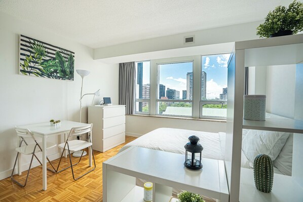 The studio features a fully equipped kitchenette, a cozy dining area, and a comfortable sleeping space, making it ideal for both short-term and extended stays. The modern bathroom comes with all essential amenities for your comfort. The thoughtfully designed layout also includes a dedicated workspace and ample storage for all your needs.