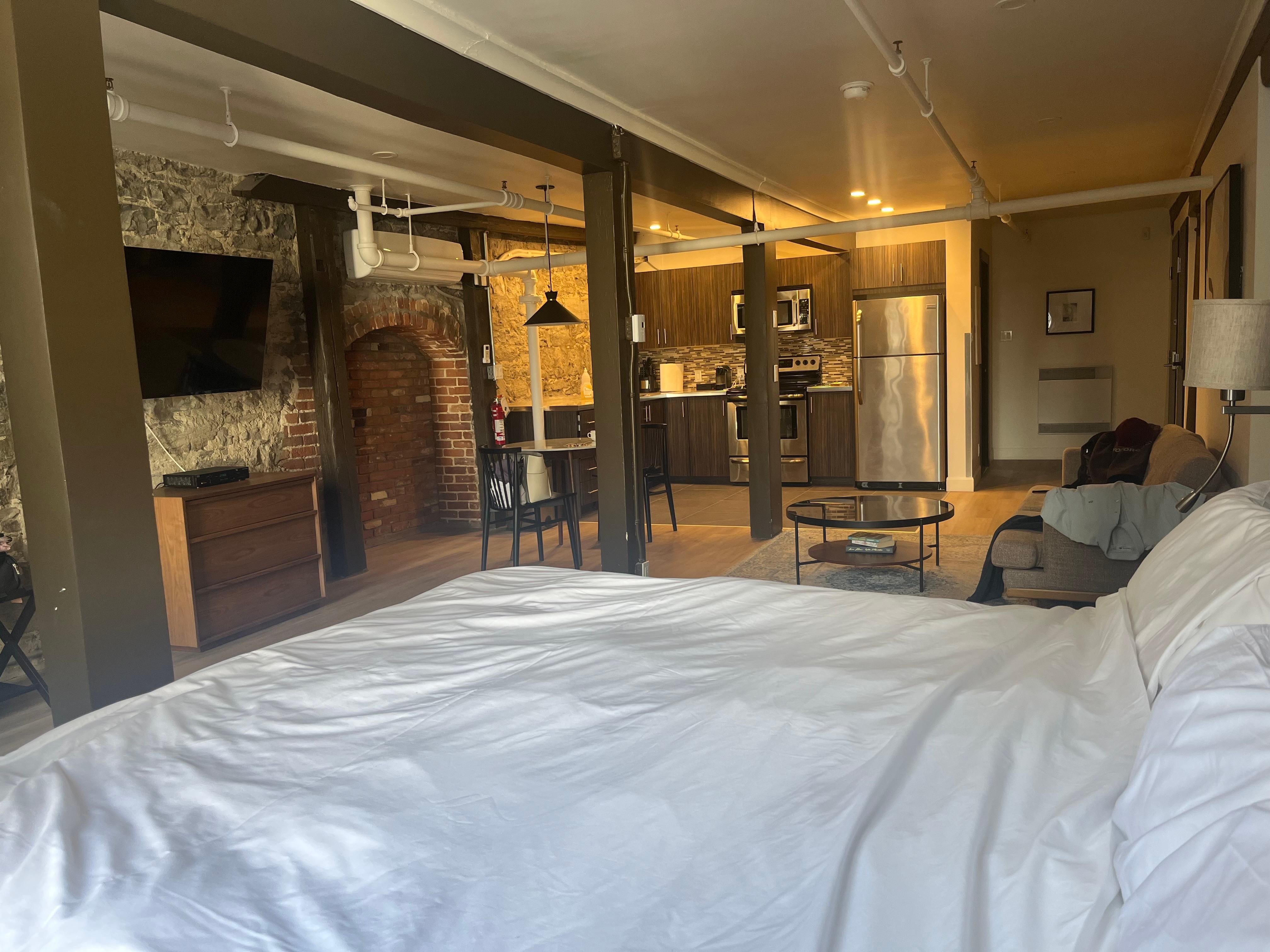 The loft itself was well designed, very clean, nicely renovated while still keeping its “old Montreal” charm. Our loft had a full kitchen supplied with essentials. Bed was so comfortable! Only wish we got a room with a fireplace.