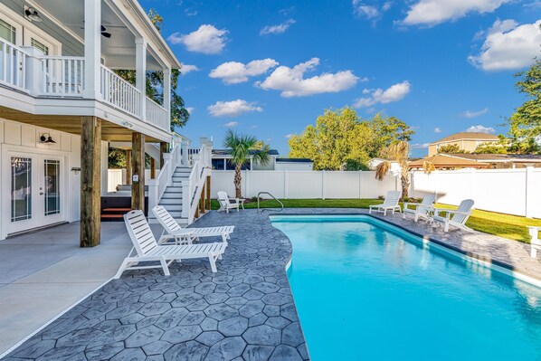 New Beach House with Private Saltwater Pool + Hot Tub! Quick Walk to Beach!