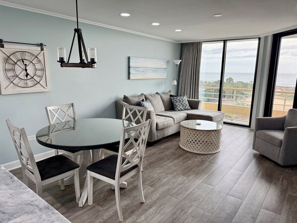 Our condo was just recently completely renovated from top to bottom. All new LVT flooring installed throughout, new hurricane proof sliding glass doors, all new farmhouse interior doors with specialty hardware, new custom drapes in living room and master bedroom, new mattresses on all beds, smart TVs, all new linens, all new furniture, new large and small appliances, recessed lighting, popcorn ceilings removed, crown molding, and more.