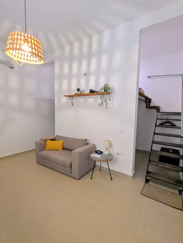 At night, the apartment stays comfortable with air conditioning, heating, and portable fans. The bed has fresh linens, extra pillows, and a simple, restful setup.