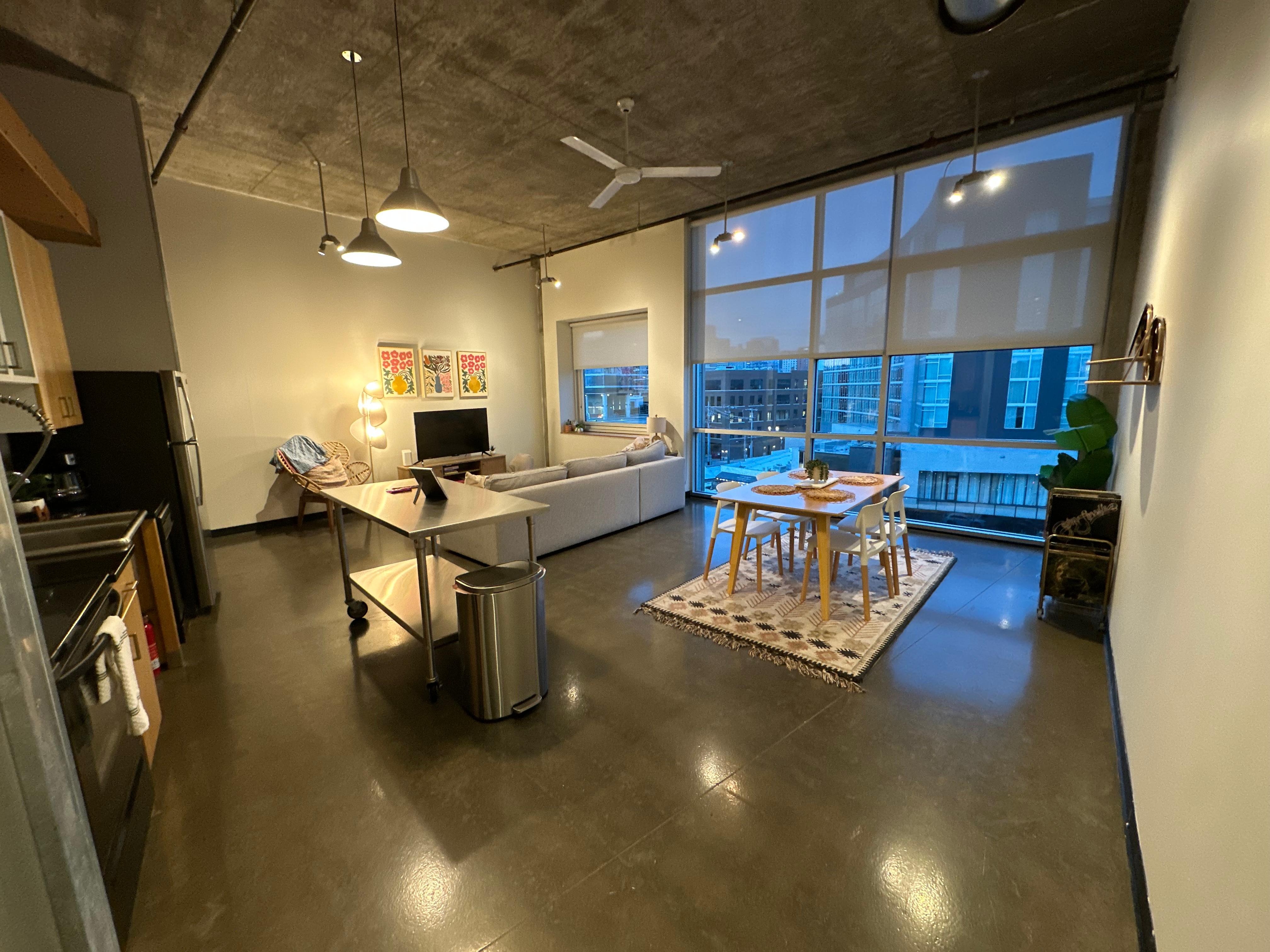 The 760 SF loft features 15 ft ceilings and huge windows that overlook the vibrant Gulch neighborhood. The loft offers a king-size bed, as well as a sleeper sofa in the living room that provides a second sleeping spot if needed. We offer a Smart-TV with all streaming capabilities (NO cable), WiFi, and a washer and dryer in the unit! The kitchen is fully stocked with basic cooking equipment for your culinary needs!
