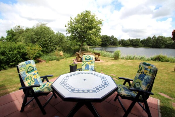 Järvenrannalla oleva loma-asunto, jossa on keittiö ja patio