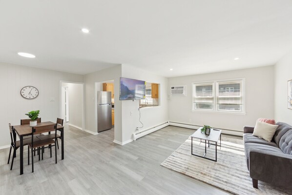 Living area with seating area, coffee table and wall mounted TV.