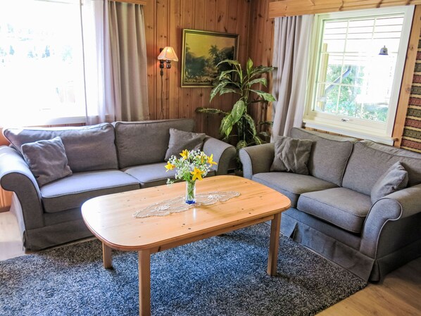 "Knatten", 4-huoneen talo, 89 m2, 2 tasossa. Maalaistyylisesti sisustettu: olo/ruokailuhuone, takkakamiina, ruokapöytä ja satelliitti TV. 1 huone, 1 parisänky (180 cm, pituus 200 cm). Läpikulkuhuone, 2 vuodetta (80 cm, pituus 200 cm). 1 huone, 2 vuodetta (70 cm, pituus 200 cm). Keittiö (uuni, astianpesukone, 4 keraaminen keittotaso, mikroaaltouuni, pakastin, kahvinkeitin), ruokapöytä. Suihku/WC. Sähkölämmitys. Alemmassa kerroksessa: sauna. Sähkölämmitys. Terassi, puutarhaistumapaikka. Terassikalusteita, puutarhagrilli (liikuteltava). Näkymä järvelle. Käytettävissä: pesukone, silitysrauta. Huomioitavaa: enintään 1 lemmikki/koira sallittu. Savuhälytin, palosammutin. 924531169