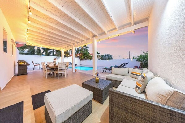 Covered Patio: Lounge seating for relaxation or enjoy a BBQ with loved ones.